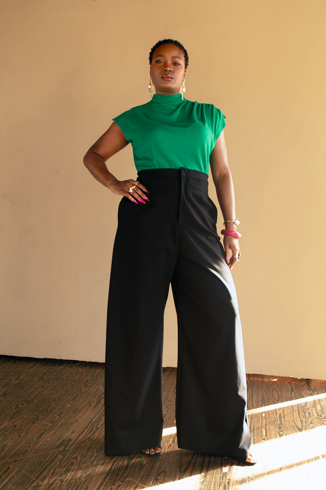Ri is wearing the Nova Top and Chrissy Trousers in size L. She is a size 12.
